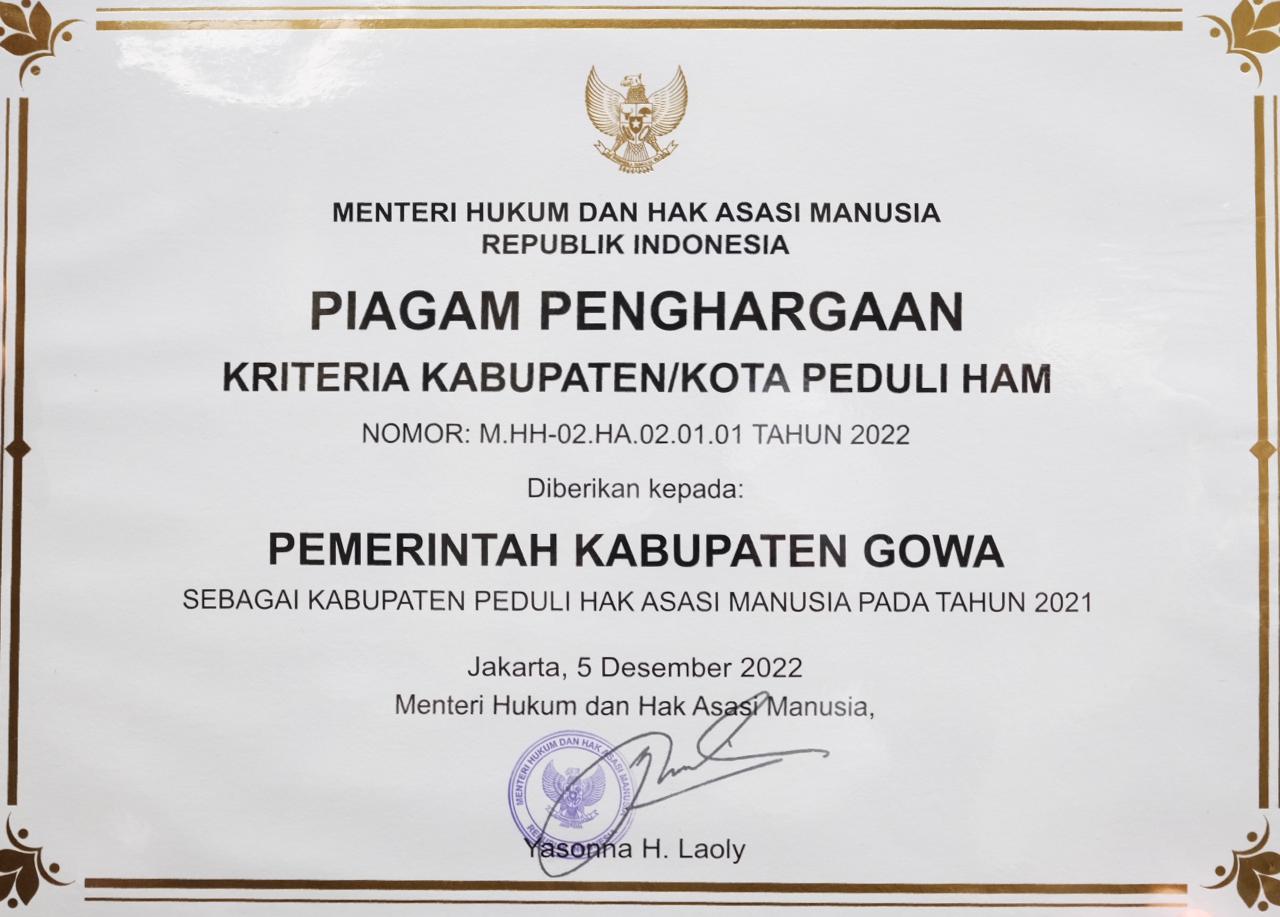 Lanjut jelasnya, penghargaan ini diserahkan pada puncak peringatan Hari HAM ke-74, penghargaan yang saya terima ini sebagai Kabupaten Peduli HAM di Indonesia. Kabupaten Gowa mendapatkan penghargaan ini karena sekarang hak asasi manusia bertumpuh pada empat kategori, yaitu kepada perempuan, teman-teman disabilitas, anak dan masyarakat