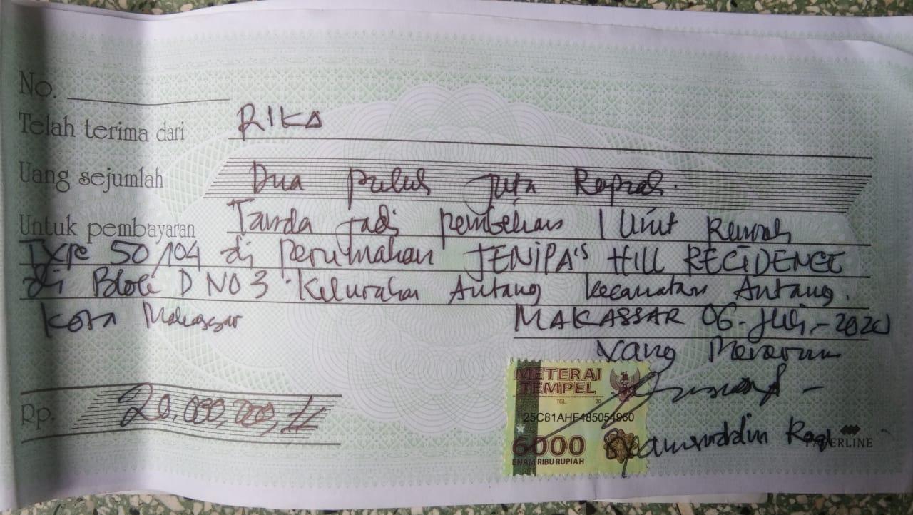 ” Saya sebenarnya takut di tipu karena kwitansi biasaji dikasikanka, seharusnya kwitansi ada logi depelovernya, masa depelover tidak ada logo-logonya dan tidak ada papan namanya itu perumahan di antang namanya Jenipas Hill Residence ” Ungkapnya