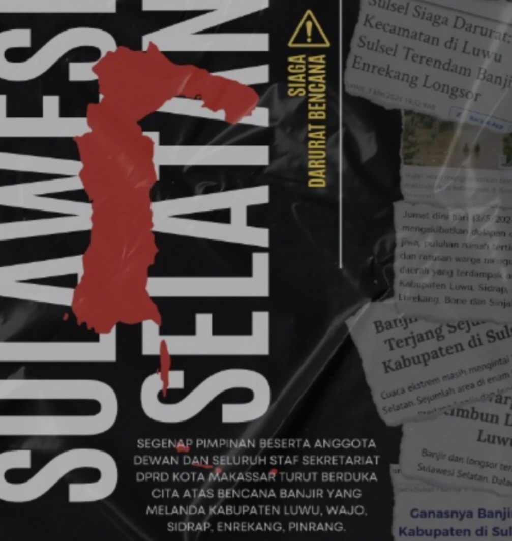 Pandawanews, Makassar–– – Dewan Perwakilan Rakyat Daerah (DPRD) Kota Makassar bersama seluruh anggota dan staf sekretariatnya menyampaikan duka cita yang mendalam atas bencana banjir yang melanda enam kabupaten di Sulsel, yaitu Luwu, Wajo, Sidrap, Enrekang, Pinrang, dan Sinjai.